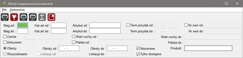 Funkcjonalność okna "Obroty magazynowe/wyszukiwanie" rozwiązana została przez tzw. radiobuttony. Przed rozpoczęciem filtrowania (wyszukiwania) danych należy zaznaczyć jedną z możliwych dwóch ścieżek "Obroty" lub "Wyszukiwanie". Zaznaczenie pierwszej spowoduje pokazanie sum obrotów w zadanym okresie, zaznaczenie drugiej spowoduje wyszukanie artykułów aktualnych.