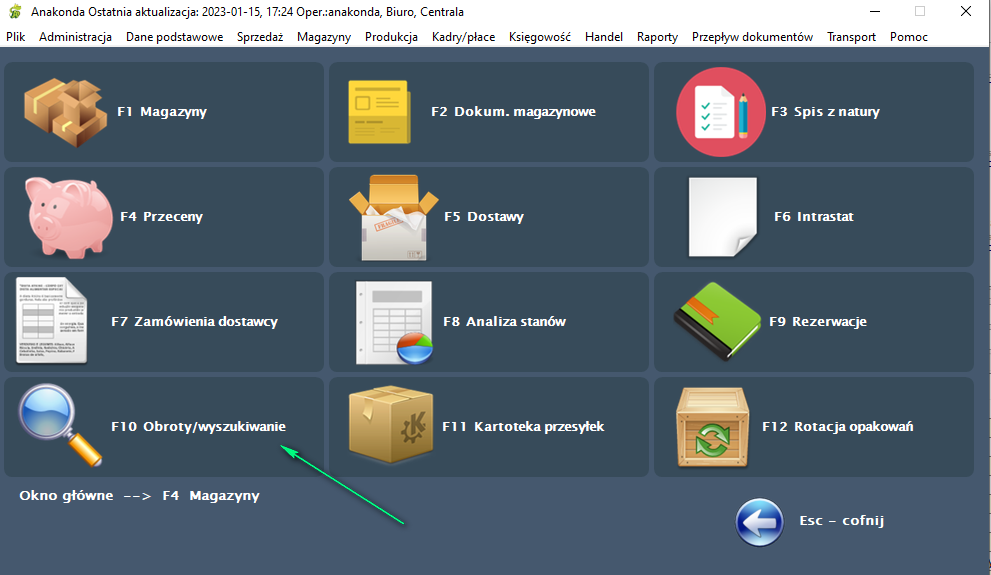 Aby rozpocząć pracę w części "Obroty/wyszukiwanie", należy w oknie głównym programu wybrać przycisk "Magazyny" - klawisz <F4>,a następnie w oknie, które się pojawi - przycisk "Obroty/wyszukiwanie" - klawisz <F10>.