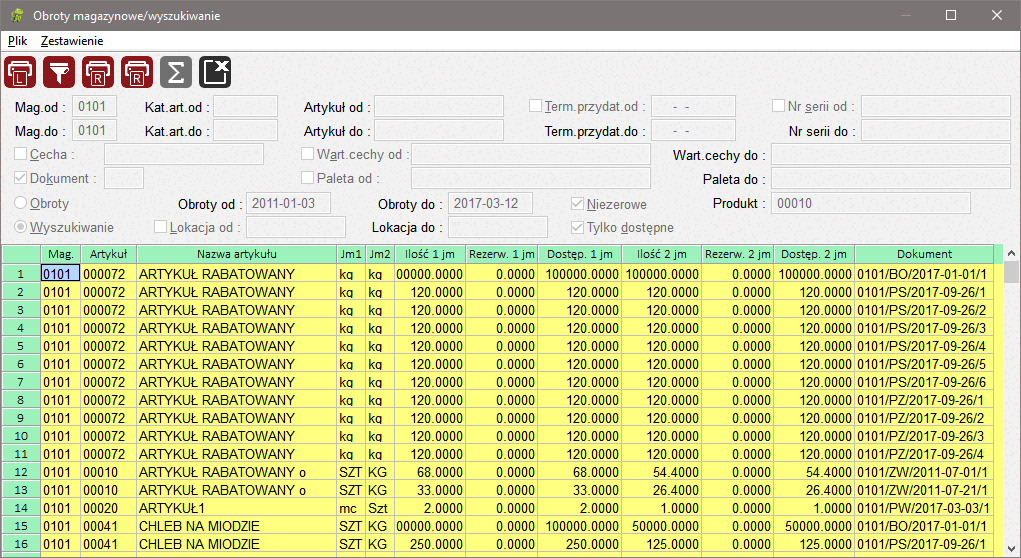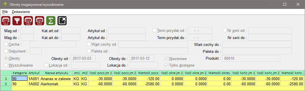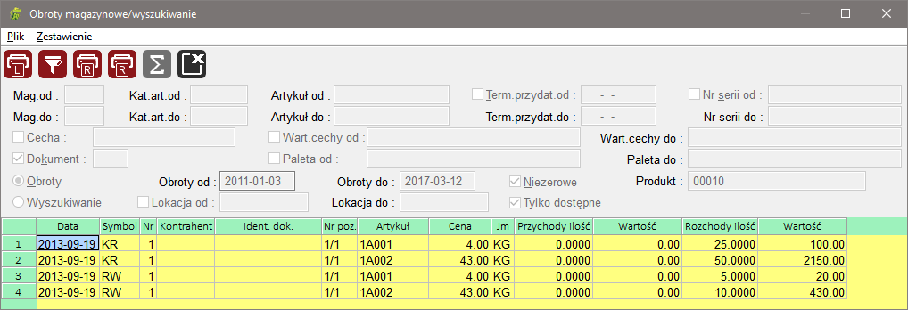 Pola tekstowe Magazyn, Kategoria, Artykuł i Lokacja umożliwiają podanie tylko początku odpowiedniego symbolu celem wyświetlenia danych. W polach tych możliwe jest skorzystanie z klawisza <F1> celem wyboru elementu z listy dostępnych wartości. Możliwe jest podawanie zakresu filtrów. Umożliwia to na przykład wyświetlenie obrotów z magazynów od 1 do 4.