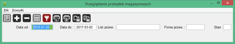 Po wybraniu funkcji "Kartoteka przesyłek" pojawią się pola filtru danych w ekranie "Przeglądanie przesyłek magazynowych":