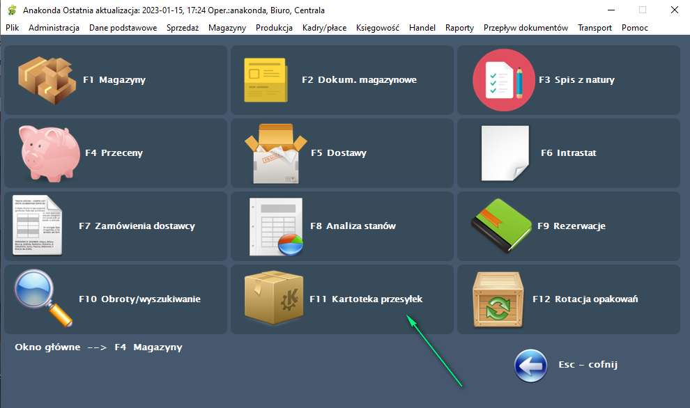 Aby rozpocząć pracę w części "Kartoteka przesyłek", należy w oknie głównym programu wybrać przycisk "Magazyny" - klawisz <F4>, a następnie w oknie, które się pojawi - przycisk "Kartoteka przesyłek" - klawisz <F11>.