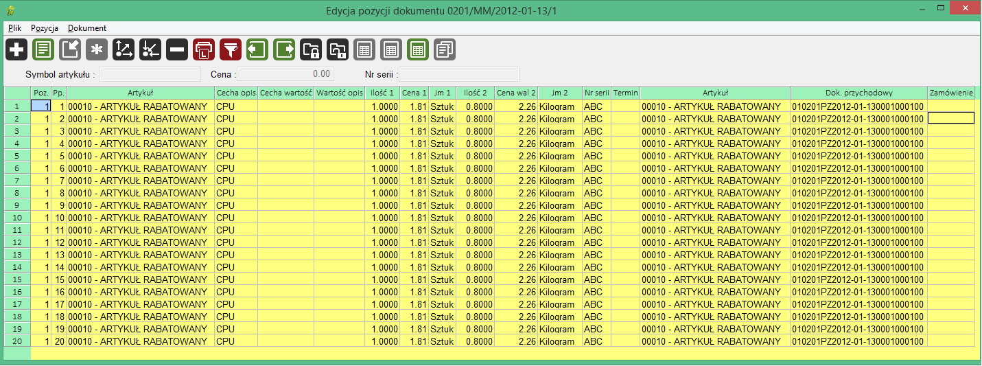 z Menu paska górnego. Pojawi się okno zawierające pozycje dokumentu magazynowego dotyczące wybranej pozycji przesyłki - okno "Edycja pozycji dokumentu magazynowego ..." Poniżej przykładowe okno z pozycjami dokumentu magazynowego.