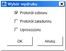 System umożliwia dla każdej przesyłki wydrukowanie jednego z dwóch, albo obu naraz dokumentów zatytułowanych "Protokół odbioru" i "Protokół załadunku". W tym celu w oknie "Przeglądanie przesyłek magazynowych" należy wybrać żądaną przesyłkę i z Menu wybrać polecenie "Przesyłki" --> funkcję "Drukuj dokument" lub nacisnąć klawisze <Ctrl> i <D> lub wybrać ikonę