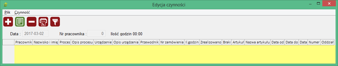 Okno zawiera listę czynności wykonanych przez pracownika. Do sekcji filtrów automatycznie wpisuje się data bieżąca. Okno zawiera dodatki w postaci sumy godzin, którą przepracował pracownik oraz imię i nazwisko pracownika, którego numer został wpisany do filtra.