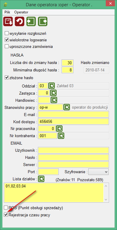 Żeby korzystać z modułu do rejestracji czasu pracy operator musi mieć w odpowiedni sposób skonfigurowane uprawnienia w danych dodatkowych