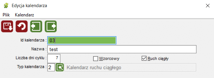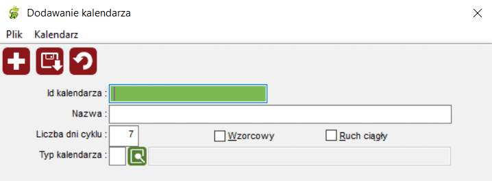 Okno umożliwia zarejestrowanie nagłówka kalendarza poprzez podanie jego identyfikatora i nazwy. Dodatkowo można zaznaczyć czy kalendarz jest kalendarzem wzorcowym i czy obsługuje pracowników pracujących w ruchu ciągłym. Dostępna jest również kontrolka z typem kalendarza. Jeżeli wybrany zostanie typ "P" (istnieje możliwość użycia słownika) wówczas kalendarz będzie stosowany w planie produkcji