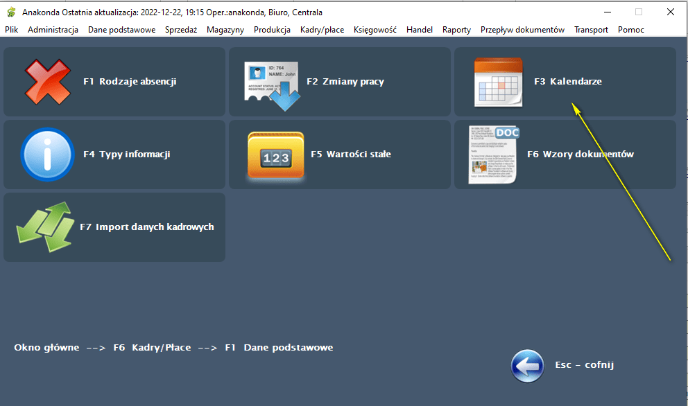 Aby skorzystać z działu "Kalendarze" należy w oknie "Dane podstawowe" modułu "Kadry/Płace" wybrać przycisk "Kalendarze" lub nacisnąć klawisz <F3>: