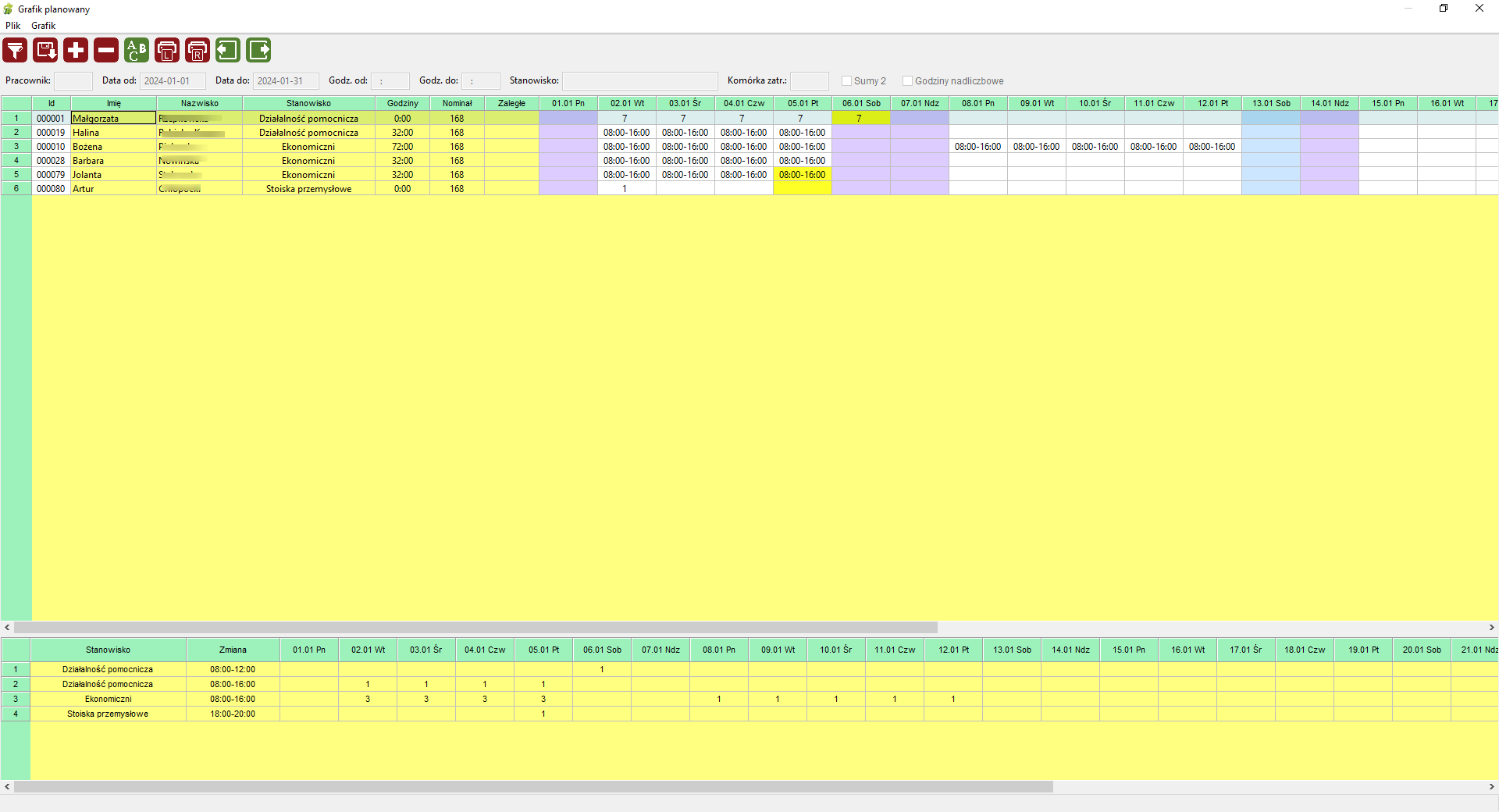 Grid dolny zawiera podsumowanie ile osób powinno przyjść na daną zmianę na podanym stanowisku. Ma tyle wierszy, ile unikalnych stanowisk i zmian znajduje się na gridzie z góry. Dane liczone są po stronie klienta Anakondy i aktualizowane na żywo, pozwala to łatwo określić czy stanowiska są obsadzone wystarczającą liczbą osób.