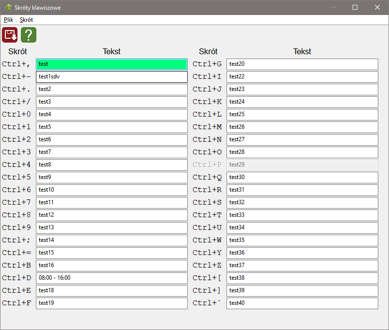 UWAGA: Ze względu na błąd w obsłudze zdarzenia CharHook w bibliotece wx.Python podczas edycji zawartości komórki klawisz <Alt> jest traktowany jak klawisz <Ctrl>, oznacza to, że dla powyższych skrótów wpisanie 'UŻ' wypełni pole tekstem 'test37'. Aby uniknąć problemów należy nie używać polskich znaków w symbolach absencji, albo dla tych liter nie tworzyć skrótów.